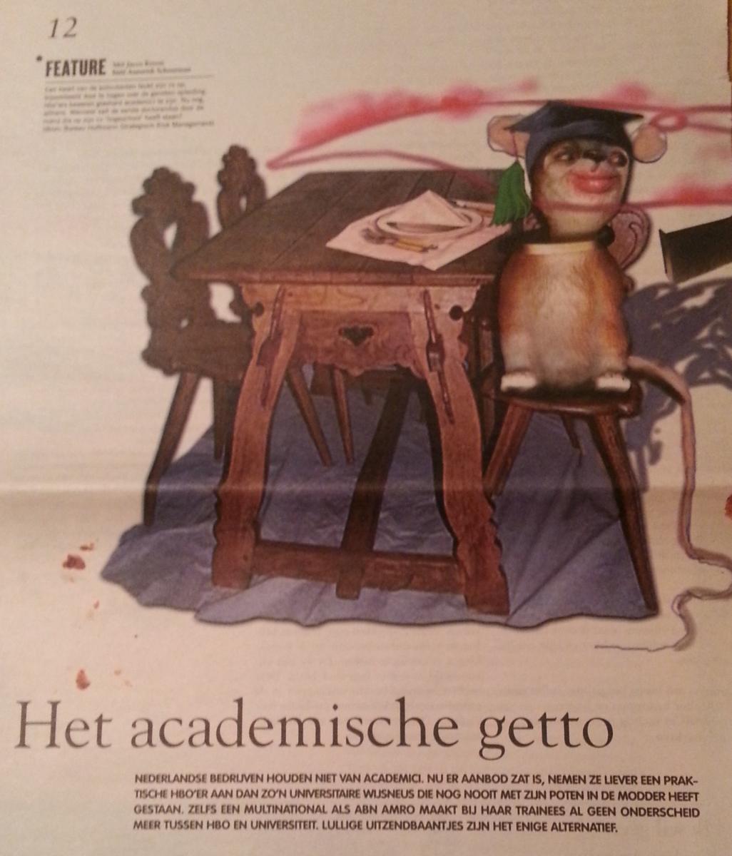 Ik was dus nooit van plan om te blijven, maar bleef toch zo lang mogelijk. Waarom? Dat is heel eenvoudig: ik vond onderzoek heel leuk en er schoot me gewoon niks beter te binnen dan dat de universiteit een noodzakelijke voorwaarde was om daar mee bezig te blijven. Maar in 2002 was het dus zover en ik betrad de niet-universitaire arbeidsmarkt, volkomen onvoorbereid op wat me daar te wachten stond. De afbeelding hiernaast is van een artikel in De Intermediair uit 2004. De titel, “Het academische getto”, verwijst naar het overdonderende gebrek aan belangstelling van het bedrijfsleven voor jonge doctoren; wat hen restte waren “lullige uitzendbaantjes”. Ik denk dat de niet-universitaire arbeidsmarkt nu anders is dan toen, al is het maar omdat “de vaste baan” als verschijnsel aan het verdwijnen is; maar jonge doctoren lopen nu tegen vergelijkbare verwachtingen aan over hoe ze van meerwaarde kunnen zijn voor niet-universitaire werkgevers. Met name voor doctoren in de alfa- en gammadisciplines is het lastig om werk te vinden dat past bij hun opleiding tot wetenschapper. In die opleiding leer je om moeilijk te doen. Als je niet moeilijk doet, is je onderzoek waarschijnlijk niet vernieuwend. Je kunt eigenlijk pas een bijdrage aan de wetenschap doen, en daar gaat je promotieonderzoek tenslotte over, als je moeilijk doet. Maar buiten de wetenschap zit bijna niemand te wachten op moeilijk-doeners. Dat was tenminste ook mijn ervaring.
