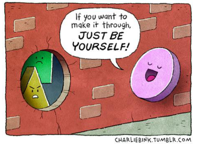 Het laat zien hoe gemakkelijk het is om als cirkel je eigen privilege niet te zien en om je als vierkant of driehoek hierover op te winden. Maar er zijn andere reacties dan verontwaardiging, teleurstelling en zelfgenoegzaamheid mogelijk: bemoei je niet met elkaar en bouw aan je eigen andere kant een mooie wereld voor jezelf, of sla samen nieuwe vormen in de muur zodat iedereen over en weer kan gaan. Dat laatste vraagt niet om benoeming maar om uitvinden hoe iemand genoemd wil worden, zoals in het gedicht van Neeltje Maria Min uit 1944: