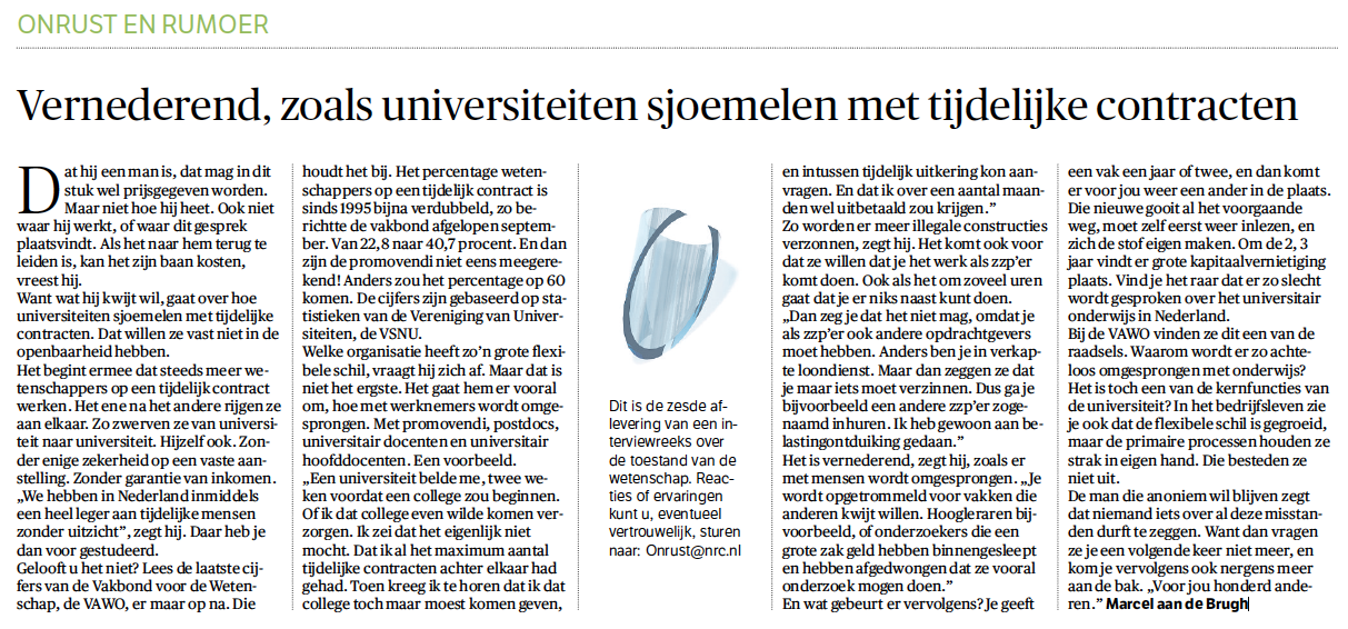 8 februari 2014 – NRC, Onrust en Rumoer, Marcel aan de Brugh – Vernederend, zoals universiteiten sjoemelen met tijdelijke contracten (pdf, hieronder integraal overgenomen)