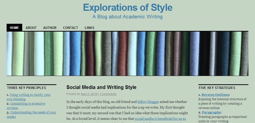 Explorations of Style. A Blog about Academic Writing offers readers an ongoing discussion of the challenges of academic writing. The ability to formulate and clarify our thoughts is central to the academic enterprise; this blog discusses strategies to improve the process of expressing our research in writing.