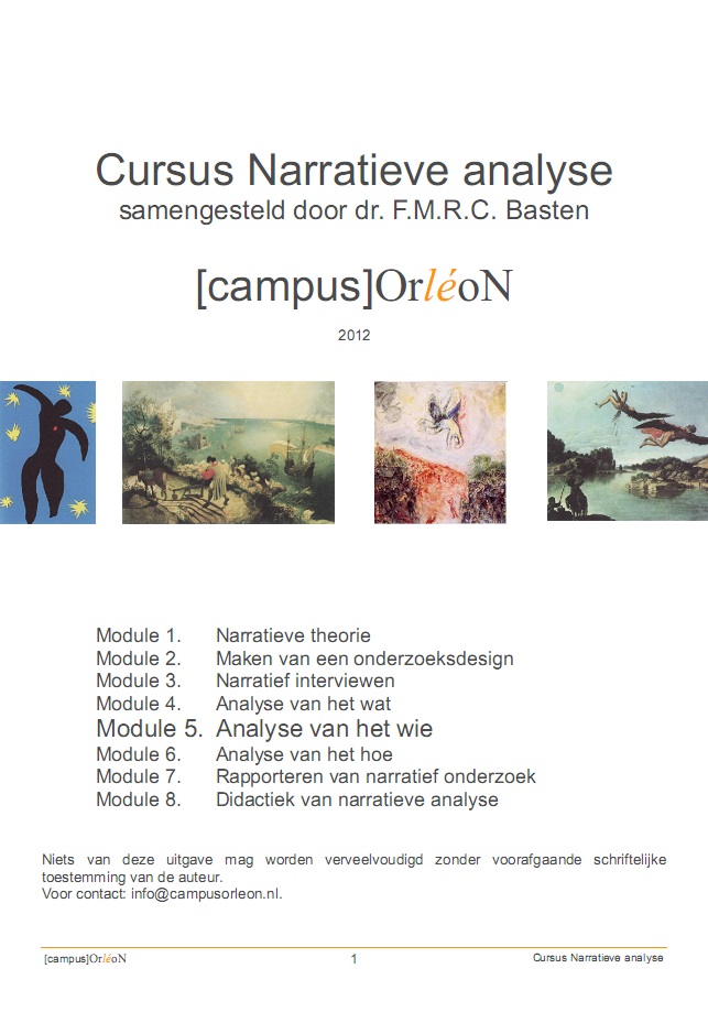 Het analyseren van narratieven vraagt bijzondere aandacht, omdat taal altijd open staat voor interpretatieverschillen. Om die zo klein mogelijk te houden, heb ik een systematiek ontwikkeld voor een analyse op drie niveaus: het wat (thematisch), het wie (positioneel) en het hoe (waarderend). In de reader Narratieve analyse 2 analyse van het wie staat beschreven hoe je een analyse van posities in narratieven maakt: welke entiteiten (personen, dingen, instanties) spelen een rol in het verhaal en hoe verhouden die zich tot de verteller?